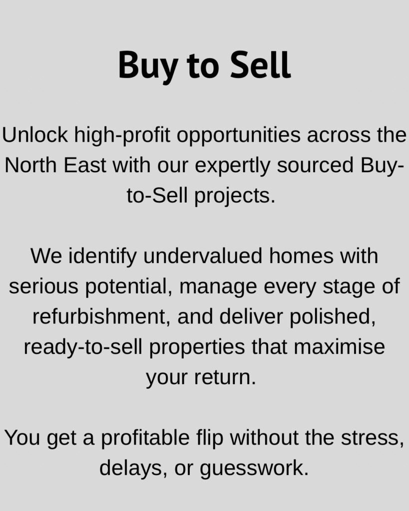 With strong relationships across the North East’s estate agents, surveyors, trades and financial partners, we offer our clients exclusive access to off-market deals and refurbishment opportunities before they reach the wider market. Our process is designed to protect your investment and maximise your returns, giving you peace of mind at every stage.